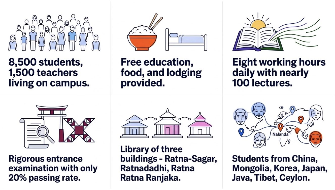 The Chinese Buddhist pilgrim spent eight years at Harsha's court and authored the Si-Yu-Ki — an invaluable record of India's geography, society, religion, and education during this period.