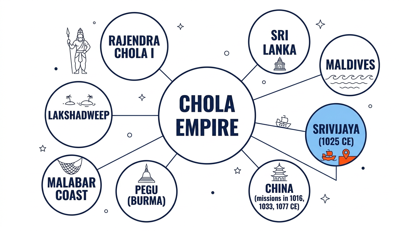 Rajaraja Chola I launched several naval campaigns resulting in the capture of Sri Lanka, the Maldives, and the Malabar Coast. These conquests were not mere raids but structured efforts to control the strategic sea lanes that connected the Indian subcontinent with Southeast Asia and China. In 1025 CE, Rajendra Chola I launched a celebrated naval expedition against the ports of the Srivijaya Empire — an entrepôt-based polity centred on the island of Sumatra — as well as against the Burmese kingdom of Pegu. This expedition, targeting cities as far away as modern Malaysia, Indonesia, and southern Thailand, remains one of the most remarkable maritime enterprises in pre-modern Asian history.