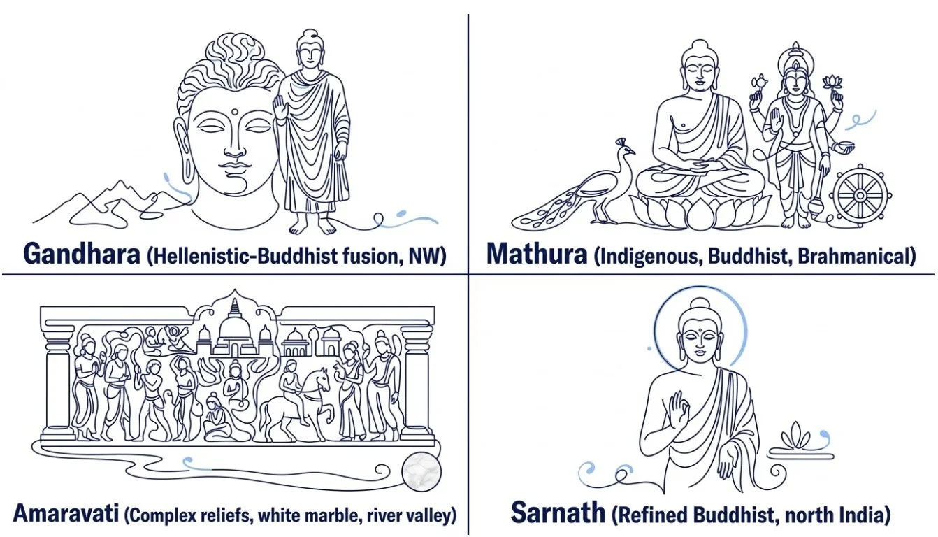 Sculptural art in the post-Mauryan period cannot be properly understood in isolation from its architectural context: sculptures functioned as integral components of larger ensembles — stupas, chaityas, and viharas — and only later began to be produced as independent devotional images. The period witnessed the crystallisation of distinct regional schools, each with its own aesthetic vocabulary, materials, and iconographic conventions.