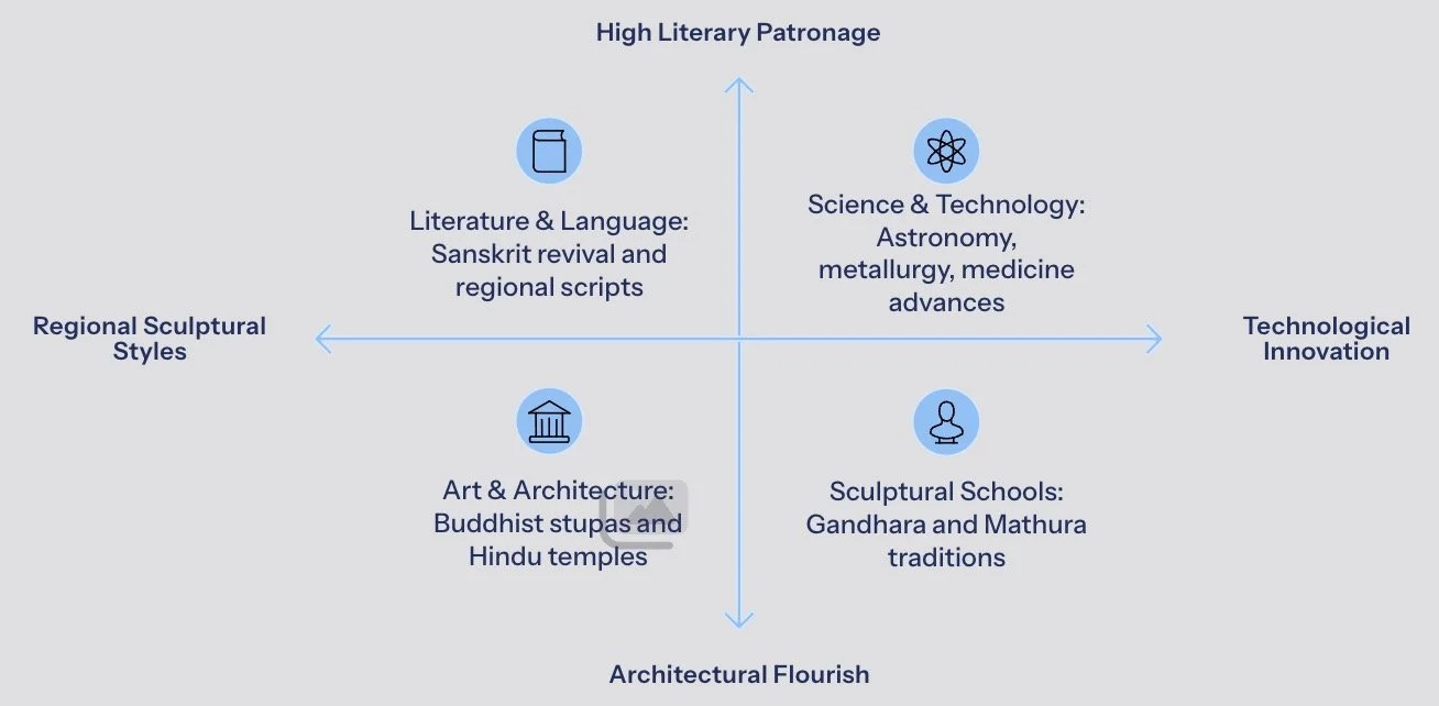 The centuries following the decline of the Mauryan Empire — roughly spanning 200 BC to AD 300 — witnessed one of the most dynamic and cosmopolitan phases in ancient Indian history. Under the patronage of the Kushans, Shakas, Satavahanas, and Tamil kingdoms, India experienced a remarkable efflorescence of literary creativity, scientific exchange, artistic innovation, and architectural achievement.