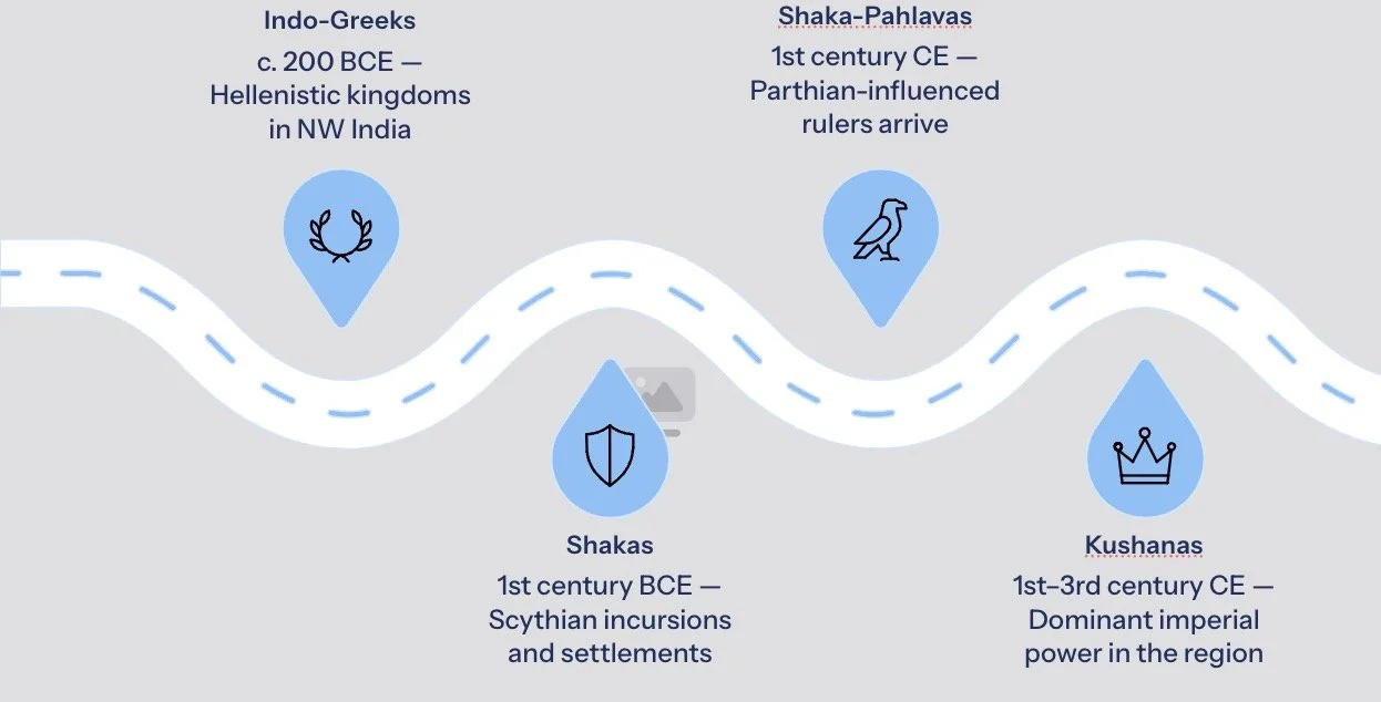 The period from approximately 200 BCE to 300 CE represents a uniquely transformative era in South Asian history. The successive waves of Indo-Greek, Shaka, Parthian, and Kushana rule did not simply impose foreign governance — they fundamentally reshaped the cultural, artistic, religious, and administrative landscape of the subcontinent in ways that endure to this day.