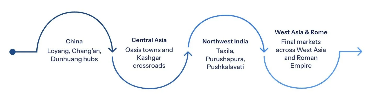 The demand for Chinese silk in the Mediterranean region was the single greatest stimulus to trans-regional and trans-continental trade in this period. The great Chinese Silk Route stretched approximately 4,350 miles from Loyang on the Yellow River in China to Ctesiphon on the Tigris in West Asia — one of the longest sustained commercial arteries in the ancient world. North-west India sat at a critical junction in this system, serving as the point where Chinese exports crossed into the subcontinent and Indian goods moved westward.