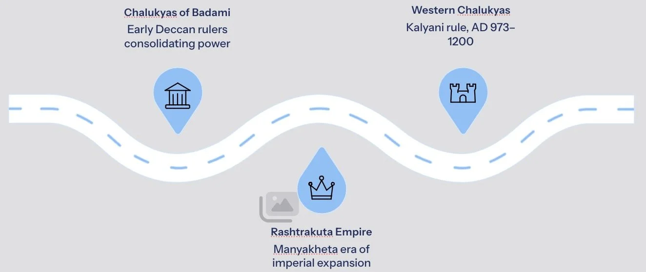 The Rashtrakutas of Manyakheta had held sway over most of Deccan and Central India for over two centuries, effectively eclipsing the earlier Chalukyas of Badami in the middle of the 8th century. However, by the late 10th century, political confusion and internal strife within the Rashtrakuta empire created an opportunity that the Western Chalukyas seized with remarkable swiftness. Claiming descent from the Chalukyas of Badami — though this genealogical claim remains historically contested — the new dynasty rose to prominence and established an empire that would dominate the Deccan for the next two hundred years.