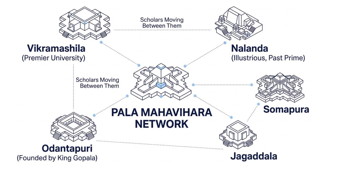 The Pala-era universities functioned as a coordinated network — scholars moved between institutions, ideas cross-pollinated, and standards were maintained collectively. This anticipates modern ideas of university consortia and academic exchange.