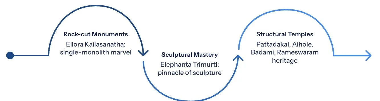 Rashtrakuta-associated monuments featured across UNESCO World Heritage Sites including Ellora, Elephanta, and Pattadakal.
