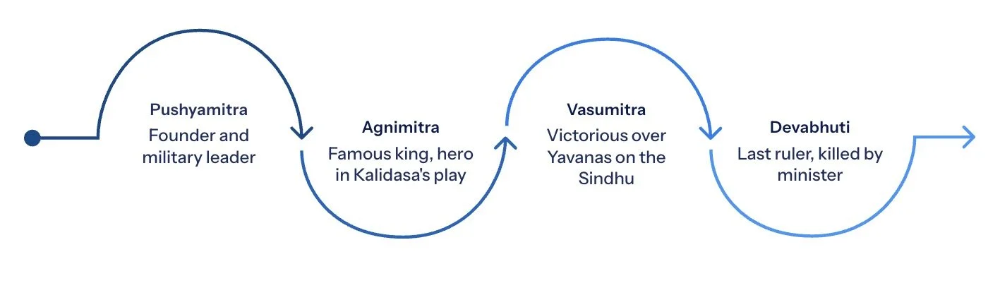 Remember : The Sunga period is notable for three key things — military defence of north India, the religious shift from Buddhism to Brahmanism, and the remarkable Buddhist art at Sanchi and Bharhut. The Heliodorus pillar is a favourite source-based question topic. Always note that the Kanva dynasty lasted only 45 years and is poorly documented outside numismatic evidence.