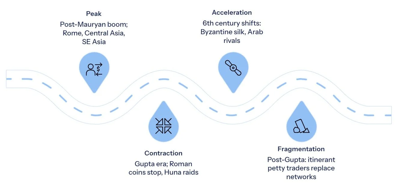 One of the most consequential economic changes of the Gupta and post-Gupta period was the decline of trade — both internal and external. Indian foreign trade had reached its peak in the post-Mauryan period, when India maintained active commerce with the Roman Empire, Central Asia, and Southeast Asia simultaneously. Commercial decline set in during the Gupta period and became markedly more pronounced by the middle of the sixth century CE. The inflow of Roman coins into India — one of the most tangible indicators of sustained trade with the West — stopped after the early centuries of the Common Era, and other evidence of contact with the Western world also became sparse.