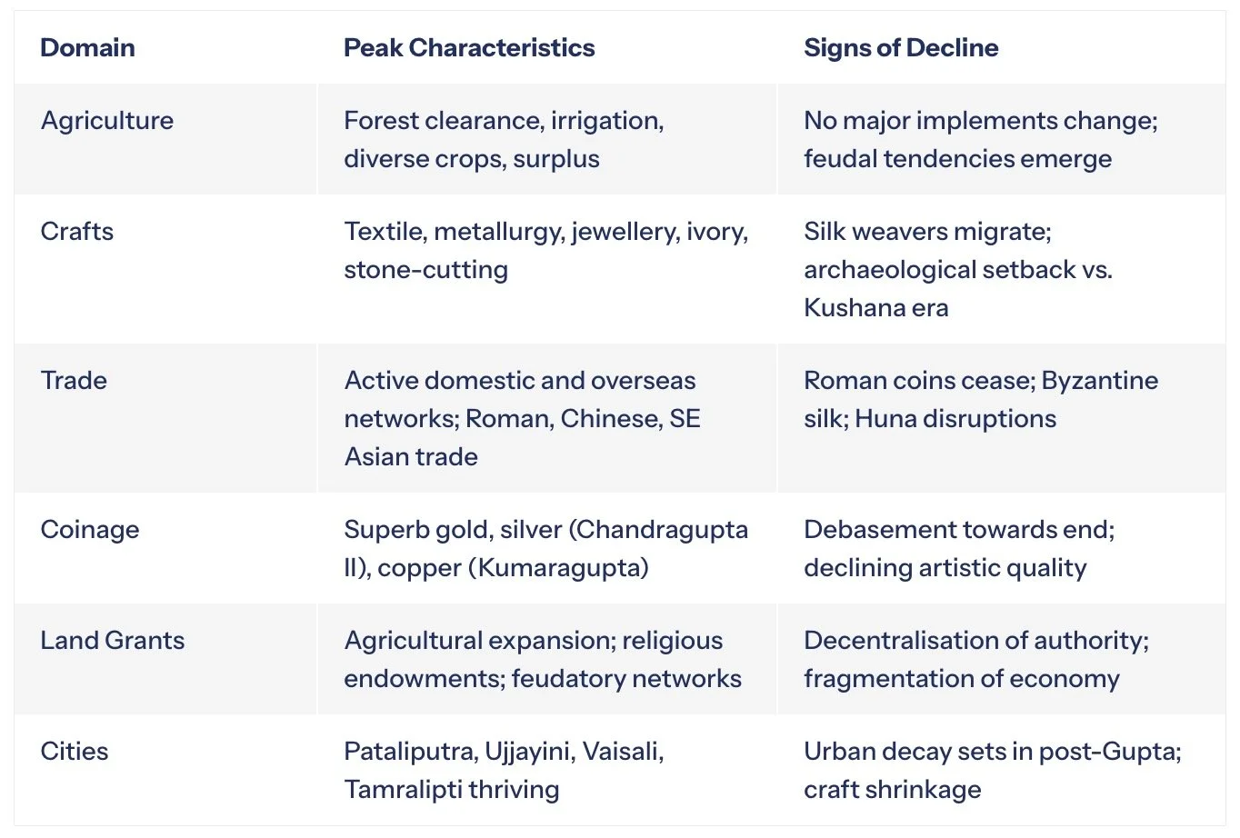 The decline of Gupta-era trade and urban centres was not a sudden catastrophe but a gradual structural transformation, driven by the convergence of external shocks — the fall of Rome, Byzantine silk cultivation, Huna invasions — with internal dynamics such as land grant devolution, the rise of self-sufficient rural units, and the social stigmatisation of long-distance commerce. Understanding both the brilliance of the Gupta economic achievement and the structural vulnerabilities that underpinned it is essential for any serious student of ancient Indian history. The Gupta economy was, in sum, a complex and dynamic system that illuminates the deep continuities and sharp transitions of one of the most formative periods in the subcontinent's long history.