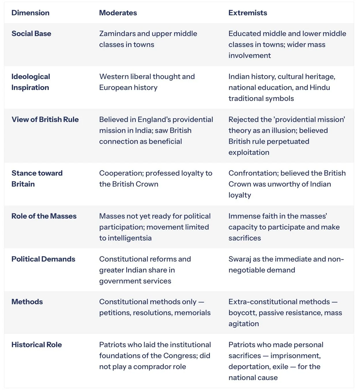 The differences between the Moderate and Extremist factions within the Indian National Congress were not merely tactical disagreements — they reflected fundamentally divergent assumptions about the nature of British rule, the capacity of the Indian masses, and the legitimate methods of political struggle. Understanding these differences is essential to appreciating the internal dynamics of the nationalist movement.
