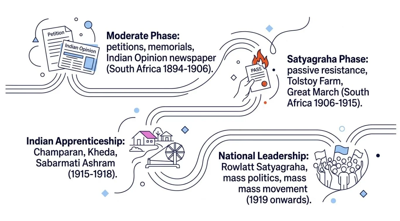From the shivering young lawyer in a Pietermaritzburg waiting room to the acknowledged leader of a mass movement capable of shaking the British Empire, Gandhi's journey was one of the most remarkable political transformations in modern history. It is worth pausing to trace the arc of that transformation through the phases of his activism.