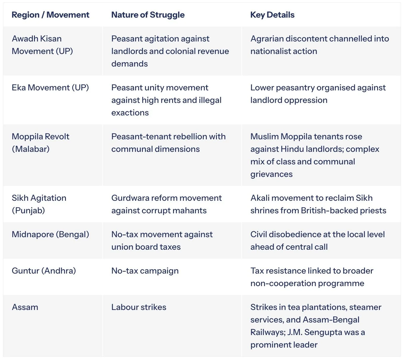 The Non-Cooperation Movement was not a monolithic, centrally-directed campaign — it ignited a host of localised struggles across different regions of India, each rooted in specific local grievances but connected to the larger anti-colonial framework provided by Gandhi and Congress. These regional upsurges demonstrated the movement's extraordinary capacity to absorb and channel diverse forms of discontent.