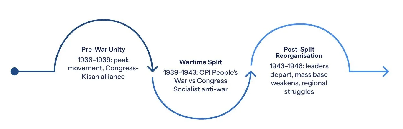 The experience of the years 1937–42 taught the Kisan movement a lesson that would shape its political calculations for decades: if it diverged too far and too clearly from the path of the national movement, it tended to lose its mass base and create damaging splits within its own leadership. The split of 1942–43 — when the CPI's People's War line separated it from the Congress Socialist members who led the Quit India Movement — was the most painful demonstration of this lesson. The growth and development of the peasant movement was, as historians have noted, indissolubly linked with the national struggle for freedom, even when the two were in tension.