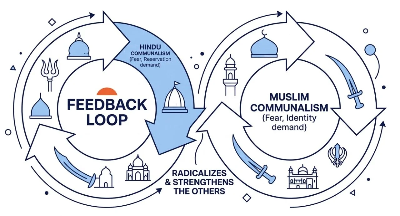 Once communalism arose and developed, its different variants fed and fattened on each other. Each extremist act by one community's communalists provided the other with evidence of existential threat; each demand accepted for one community intensified the demands of all others; each instance of communal violence produced a communal counter-reaction. The system was, by design or by consequence, self-perpetuating and self-radicalising. Liberal communalism's inherent instability — its inability to permanently contain the transition to extremism — meant that the logic of the ideology always pushed in one direction: toward greater exclusiveness, greater fear, and greater antagonism.