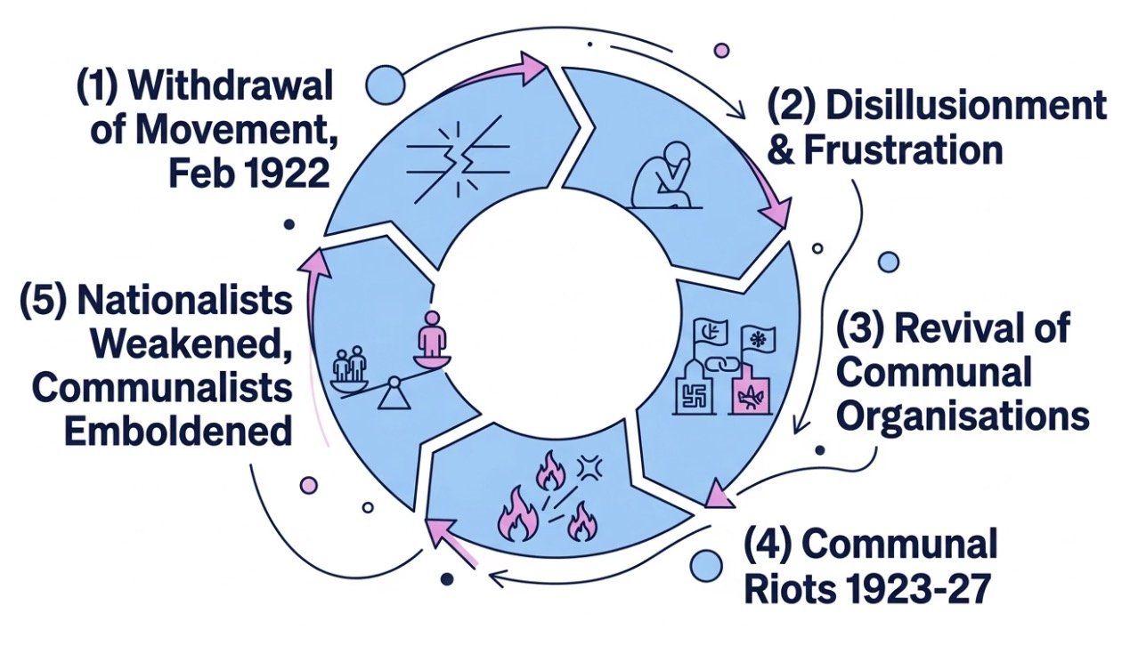 Yet the Khilafat Movement carried a structural weakness that would bear bitter fruit. While it succeeded in raising the anti-imperialist consciousness of Muslim masses, its leadership made extensive appeals to religious sentiment, utilised fatwas and religious sanctions, and emphasised Muslim solidarity — thereby strengthening the hold of orthodoxy and priesthood over political minds and keeping an opening for communal ideology to re-enter at a later stage. The nationalist leadership failed to consistently raise religious-political consciousness to the higher plane of secular political consciousness.