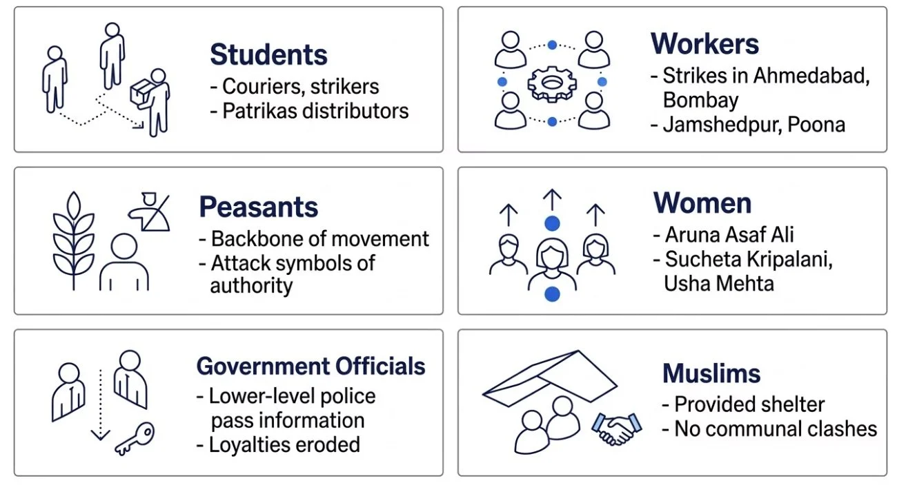 The Quit India Movement was remarkable for the sheer breadth of its participation. Unlike previous movements, which had drawn from specific social strata, this uprising cut across class, profession, gender, and region — though not without notable exceptions and contradictions.