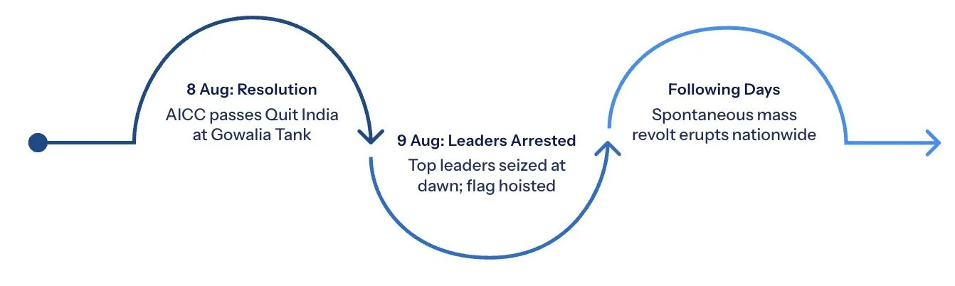 The British government was fully prepared to act. In the early hours of 9th August 1942 — within hours of the resolution being passed — all top Congress leaders including Gandhi, Nehru, Patel, and Maulana Azad were arrested in a single sweep and taken to undisclosed locations. Most would remain imprisoned for the rest of the war, cut off entirely from the masses.