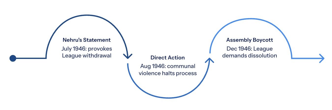 The League's withdrawal from the Constituent Assembly — despite being given everything it had asked for in terms of the interpretation of compulsory grouping — signalled a fundamental shift in Jinnah's strategy. A direct bid for Pakistan, rather than through the constitutional mechanisms of the Mission Plan, now appeared to be the objective Jinnah was pursuing. The Mission Plan had been a vehicle; having failed to deliver the destination, it was abandoned.