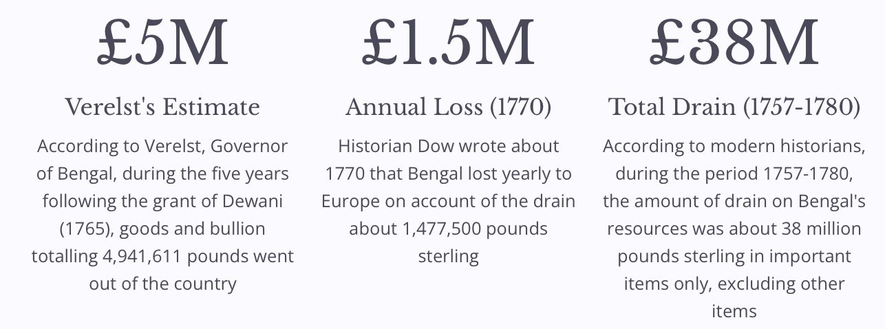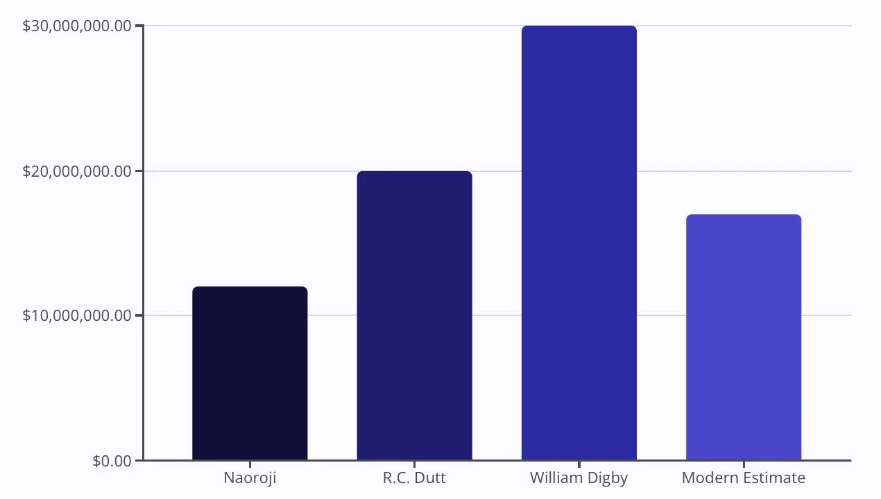 There are different estimates of the total amount of the economic drain, primarily because it is not possible to extract full and accurate statistics from incomplete and conflicting contemporary records. Nevertheless, various contemporary observers and historians have attempted to quantify the magnitude of this economic extraction.