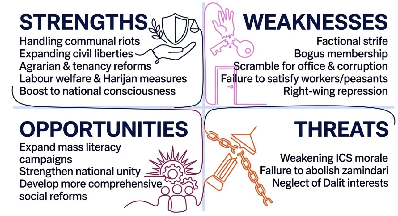 The period revealed enduring tensions — between left and right, between mass politics and parliamentary work, between principle and pragmatism. Factional strife, bogus membership, and creeping corruption exposed organisational vulnerabilities that the party would grapple with for generations. The experience of governance also clarified, painfully, the limits of reformism under colonial constitutional constraints.