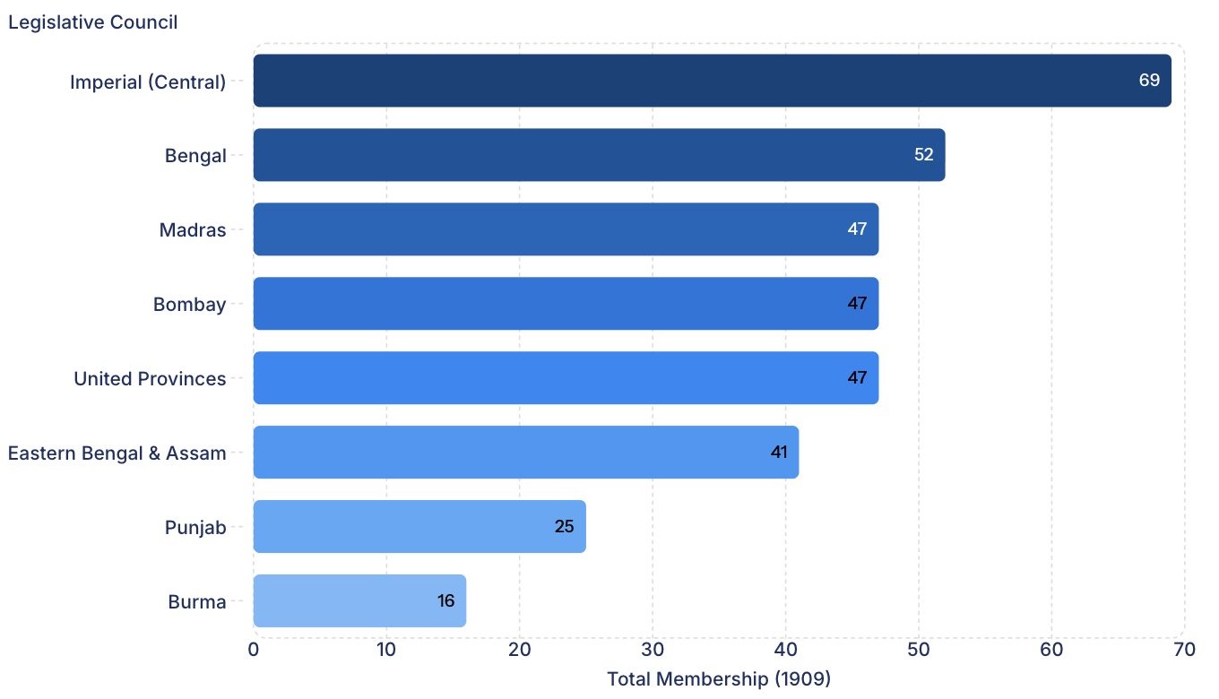 The chart above illustrates the expanded membership of legislative councils across British India under the Act of 1909. The Central (Imperial) Legislature was the largest, reflecting the hierarchical structure of the colonial governance framework.