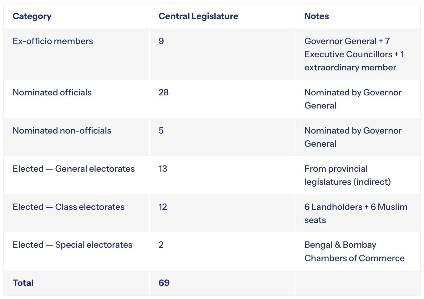 Crucially, elections were indirect. Local bodies elected an electoral college, which elected members of provincial legislatures, who in turn elected members of the Central Legislature — an elaborate system of filtering that effectively insulated the colonial government from direct democratic pressure.