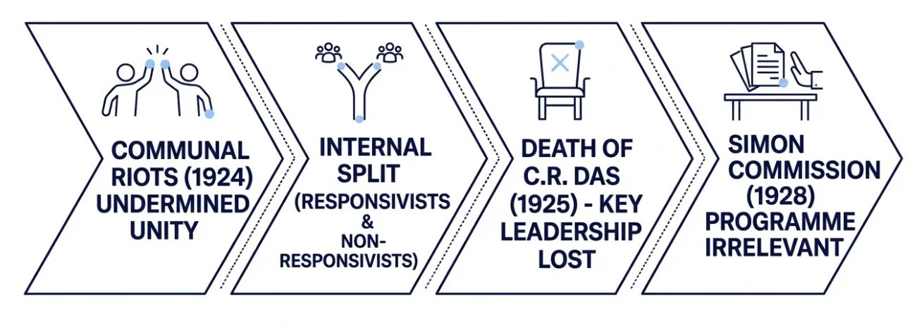 The Swarajists' trajectory from electoral success to political decline was shaped by a complex interplay of internal contradictions, external pressures, and the shifting landscape of nationalist politics in the mid-to-late 1920s. The very coalition politics that had been their greatest strength proved, in the long run, to be a source of instability — for the ideological ground on which their unity rested was, as historians have noted, weak and shallow.